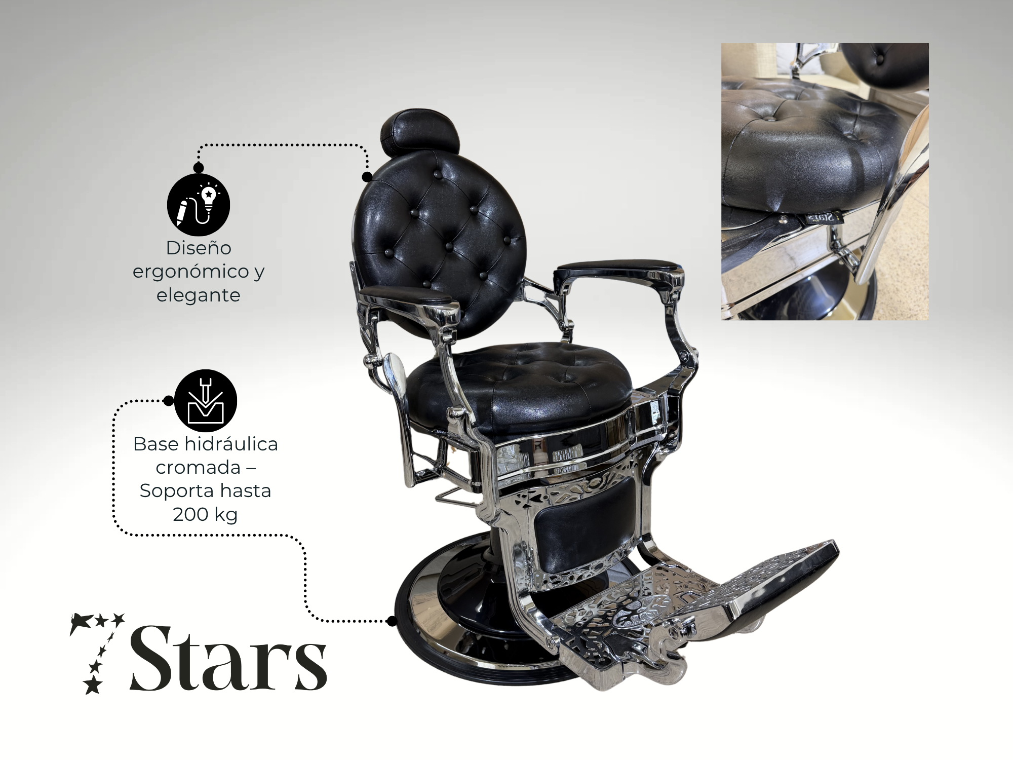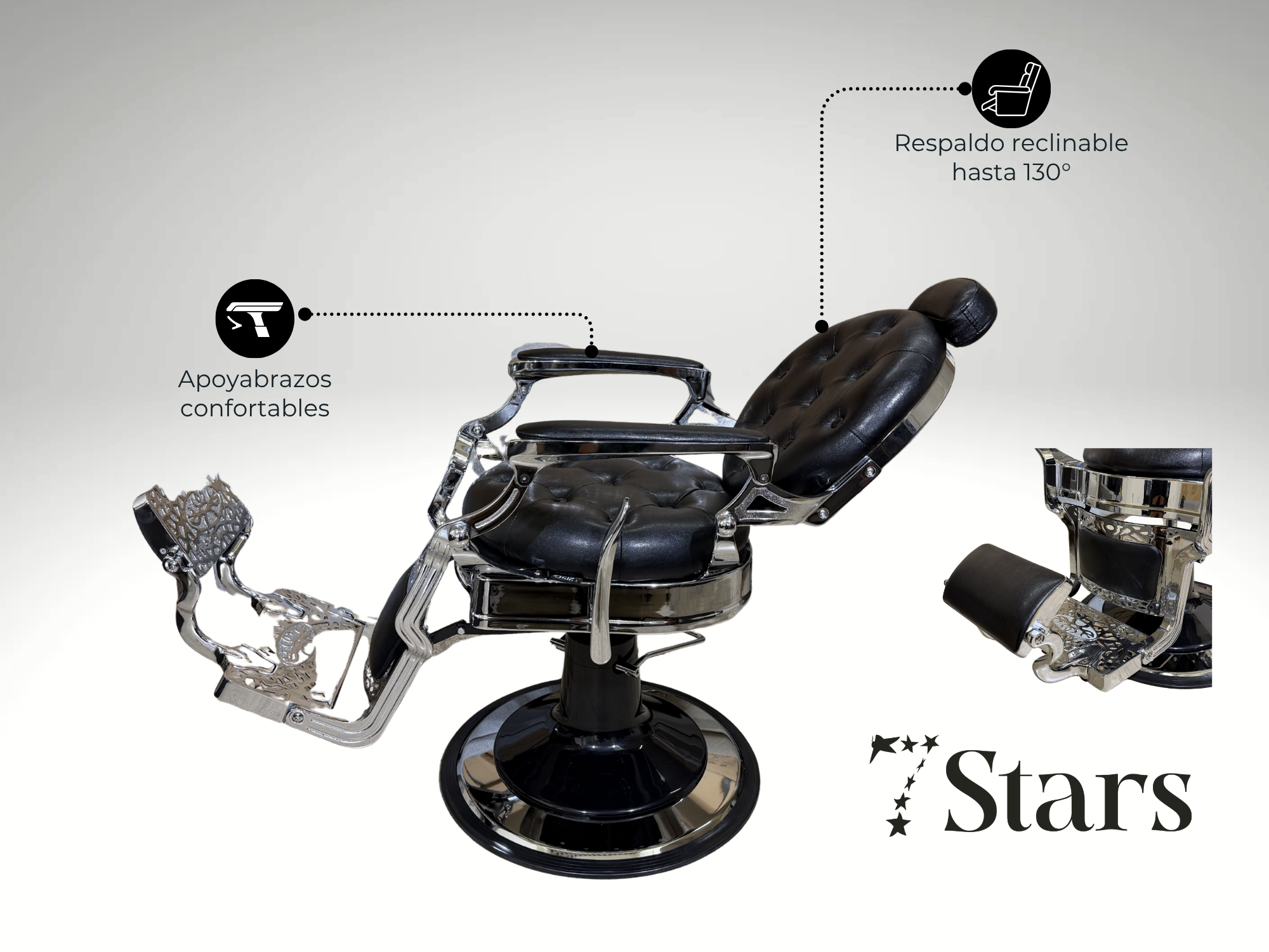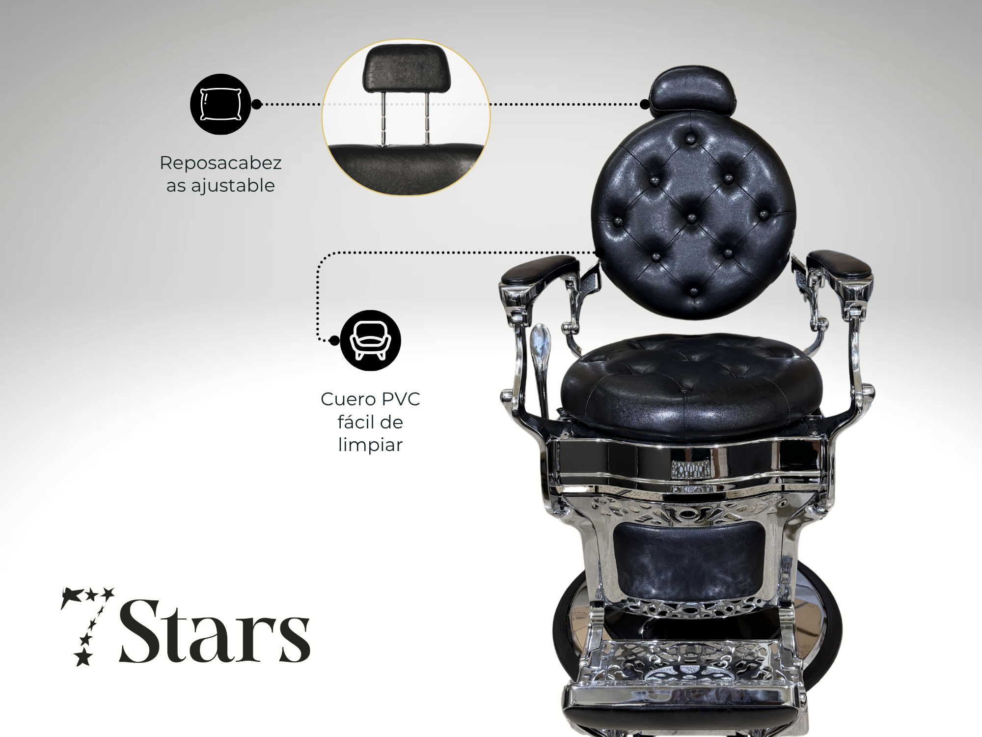 El Sillón de Barbería 7 Stars combina elegancia clásica, resistencia profesional y máximo confort para elevar el nivel de cualquier barbería o salón. Su diseño ergonómico con acabado capitoné aporta un estilo sofisticado mientras brinda una experiencia cómoda tanto para el cliente como para el barbero.